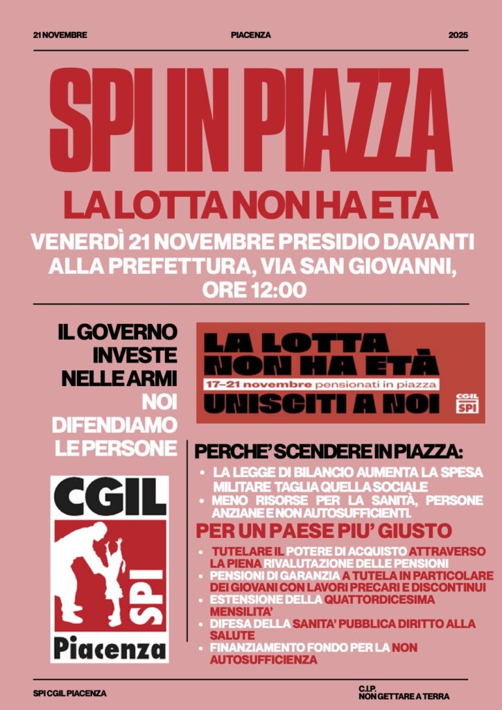 Piena rivalutazione delle pensioni, più risorse per la sanità pubblica, rafforzamento del Fondo per la non autosufficienza, estensione della quattordicesima e una pensione di garanzia per le nuove generazioni: sono queste le principali richieste portate in piazza dallo Spi-Cgil nell’ambito della mobilitazione nazionale “Spi in piazza”, che venerdì 21 novembre farà tappa anche a Piacenza.