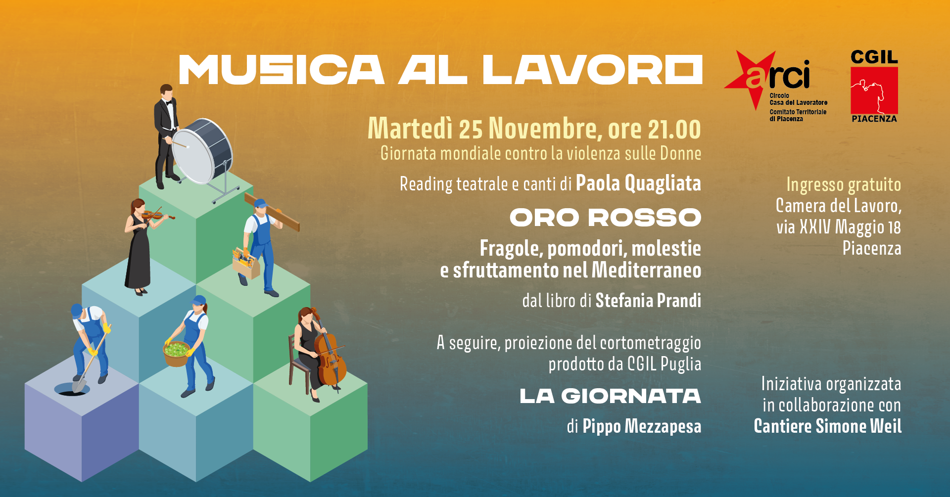 In occasione della Giornata mondiale contro la violenza sulle donne, la CGIL di Piacenza e ARCI – Circolo Casa del Lavoratore organizzano una serata speciale di “Musica al Lavoro” con un evento gratuito di teatro, musica e cinema dedicato al tema dello sfruttamento e delle molestie nei luoghi di lavoro.